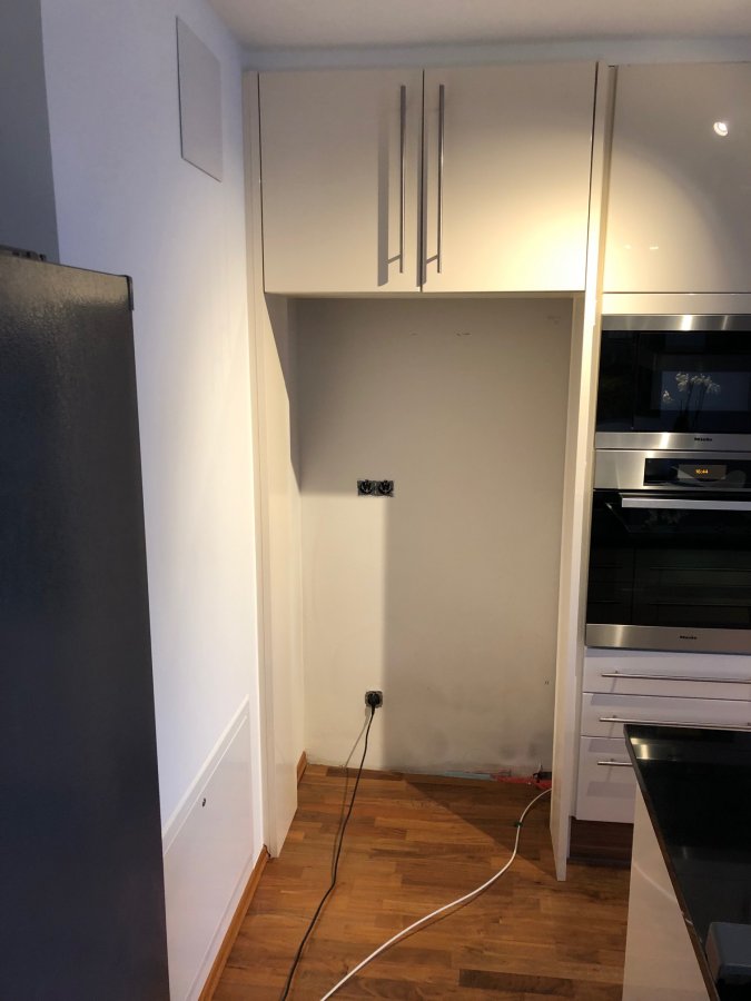 Der vorhandene Kühlschrank ist eigentlich ein Standgerät wurde aber in die Einbauküche integriert.