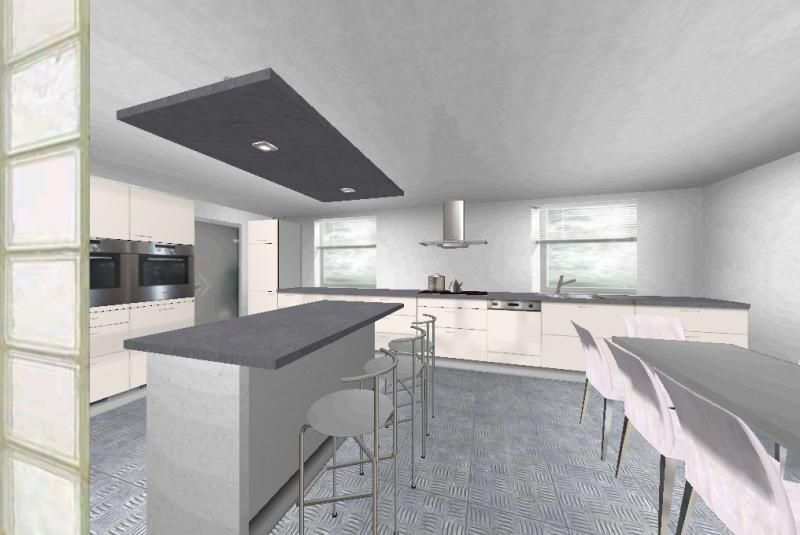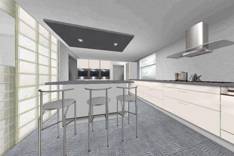 davon ausgehend kam ich auf die idee einer zweizeilen-küche, also gegenüber der hochschränke die arbeitsstrecke mit kochfeld und spüle (jeweils mit dem entsprechenden arbeitsbereich daneben), sozusagen in den raum hinein. auf der rückseite dann der imbissplatz.