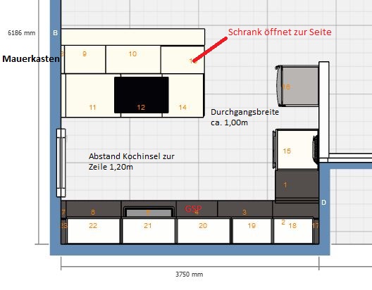 Der Schrank an der Inselecke öffnet mit einer Tür zur Seite und es sollen dort Schubladen verbaut werden, um das Geschirr und Besteck zum Tisch decken zu lagern.