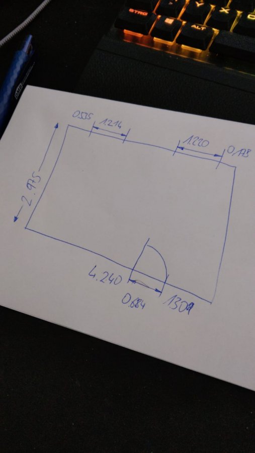 Ich hänge schon Mal eine sorgfältigere Zeichnung an. Da sieht man schon Mal, dass die Wand nicht schief ist, aber durch die unterschiedliche Positionierung von Tür und Fenster die Möblierung dort nicht so einfach ist.