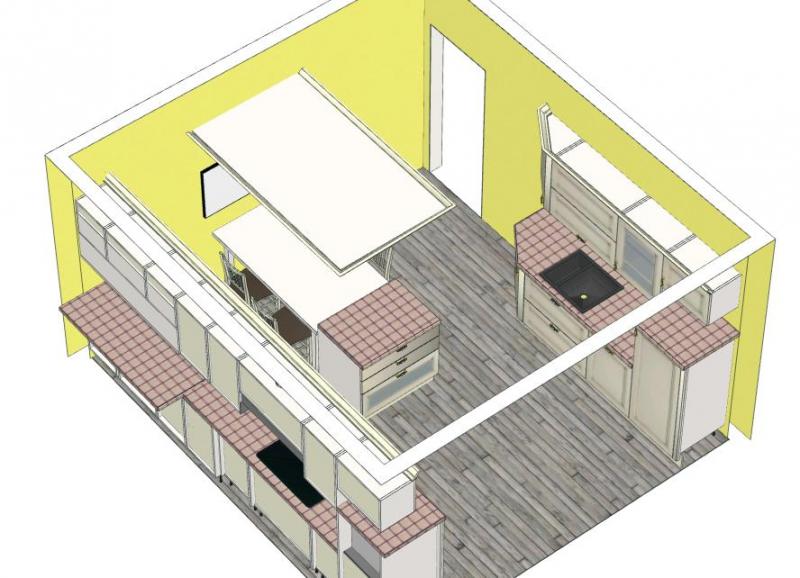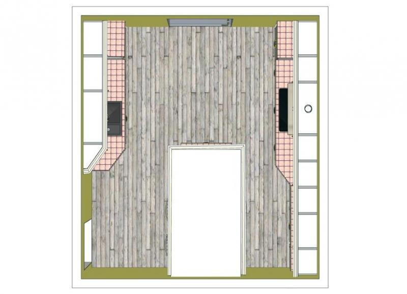 eigentlich habe ich nur die tote Ecke versucht reinzubringen und die beiden 60er in der Theke gegen einen 90er getauscht, so dass die Theke nicht so weit in den Raum reicht. Ich denke das würde auch reichen. Und wenn ich das richtig sehe, haben wir von der Tür bis zu den Hockern auch etwas mehr als einen Meter, aber es geht ja darum, dass man nicht sofort auf ein Hindernis läuft, wenn man zur Tür rein kommt.