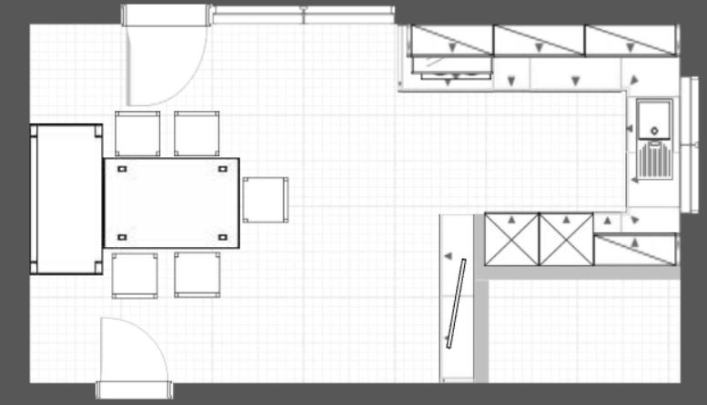 An dem Entwurf fällt mir auf, dass ich die Heißgeräte lieber im Küchenbereich hätte und dafür eher Geschirrschränke in den Wohnbereich stellen würde. An der Wand mit den Oberschränken würde ich den Hochschrank höher nehmen, so dass die Oberkante abschließt.