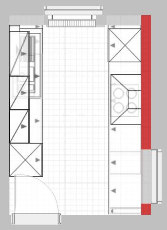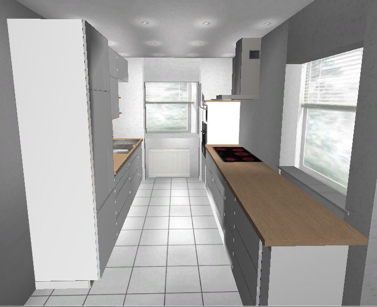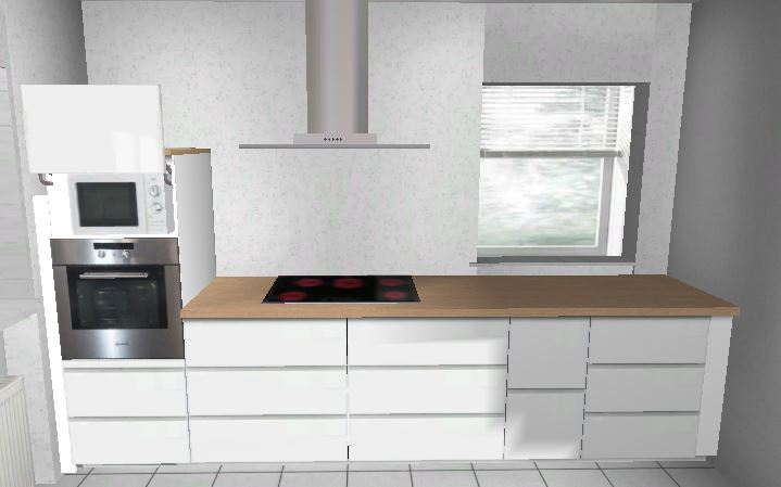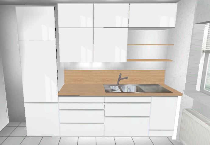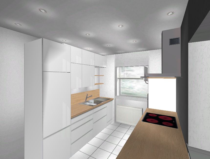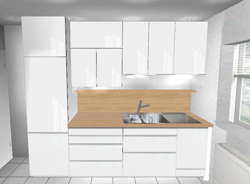 Wenn der Wasseranschluss eh verlegt vertikal werden soll, könnte er auch horizontal ein Stück wandern. Dann wäre es möglich den Kühlschrank auf die Fensterseite der Zeile zu legen. So würde man auch nicht gegen einen Hochschrank laufen, wenn man die Küche betritt.