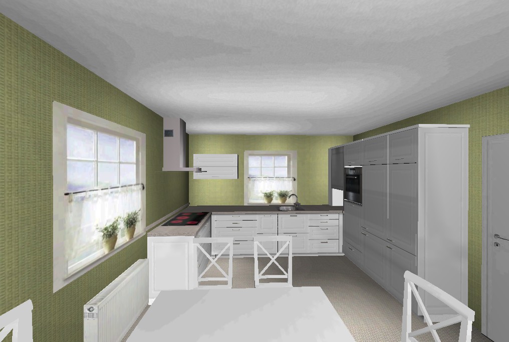Naja,wenn das Herz an der Eckspüle hängt,könnte rechts neben der Eckspüle ein 45er MUPL ,dann Geschirrspüler darüber der Backofen und dann der Kühlschrank.Platzbedarf ca.257cm.Die Wand ist lt Plan 258cm.Die Schränke unterm Fenster könnten flexibler eingeteilt werden .Den Dunstabzug kann man unauffällig als Flachlüfter integrieren.