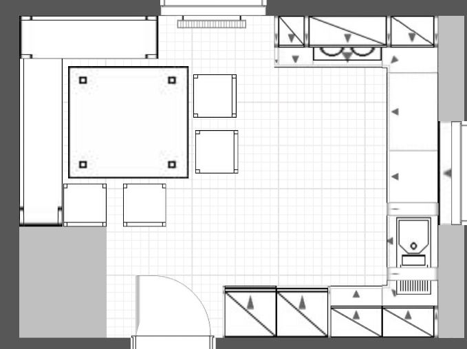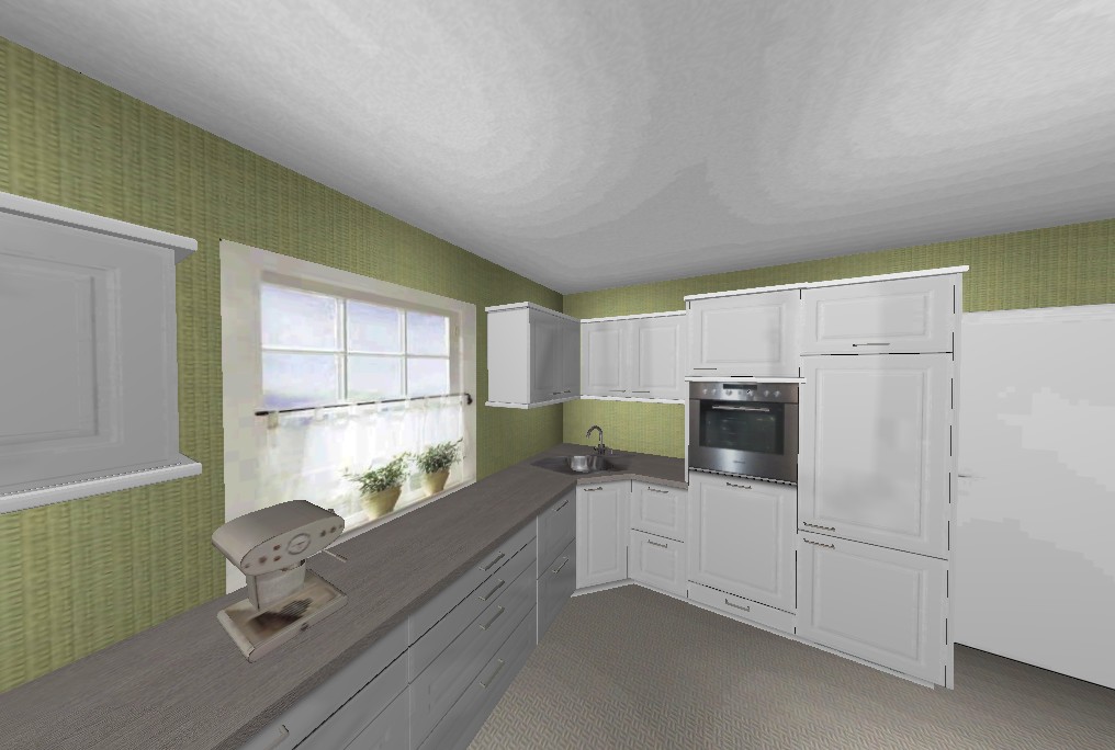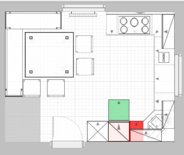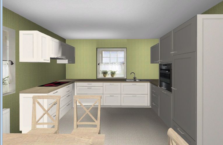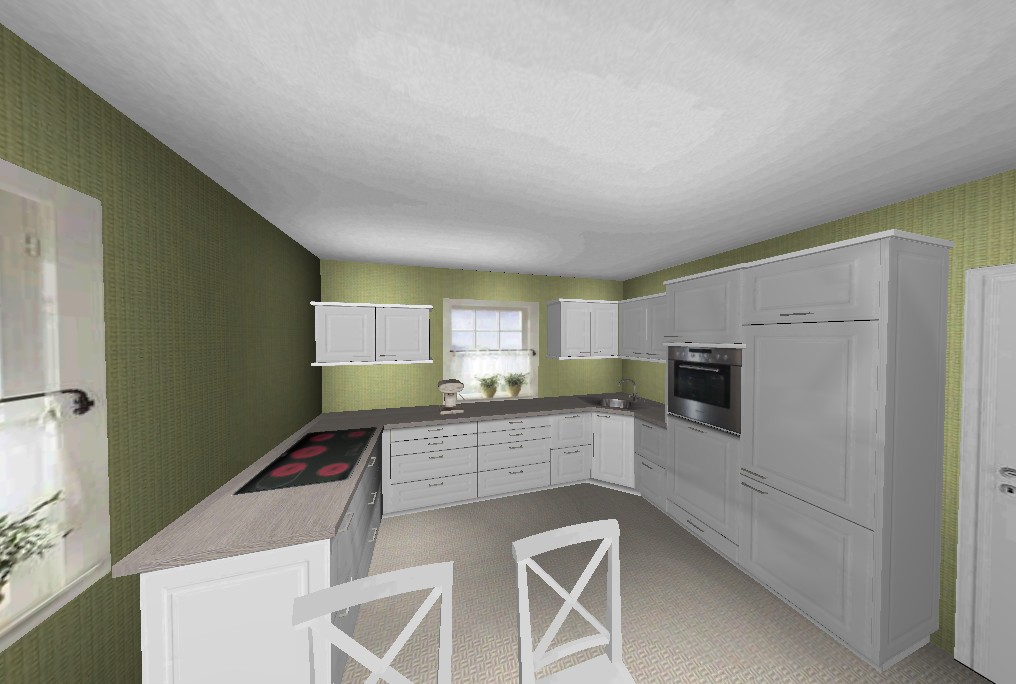 also, Platz haben wir genug. Wenn man unser altes Teil anschaut sind dort die Ecken sehr weit reingezogen und wir haben gerade mal 220cm Oberschränke und 220cm Unterschränke mit einer Mülltüre unter der Spüle.