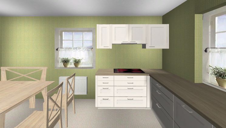 Hängeschränke an der Fensterwand ... dann muss man irgendwie mit den Hängeschränken ums Eck kommen und hat entweder Eckhängeschränke, die ich recht unpraktisch finde oder wählt auch dort tote Ecken. Das paßt aber nicht so ganz gut mit der aktuellen DAH-Planung.