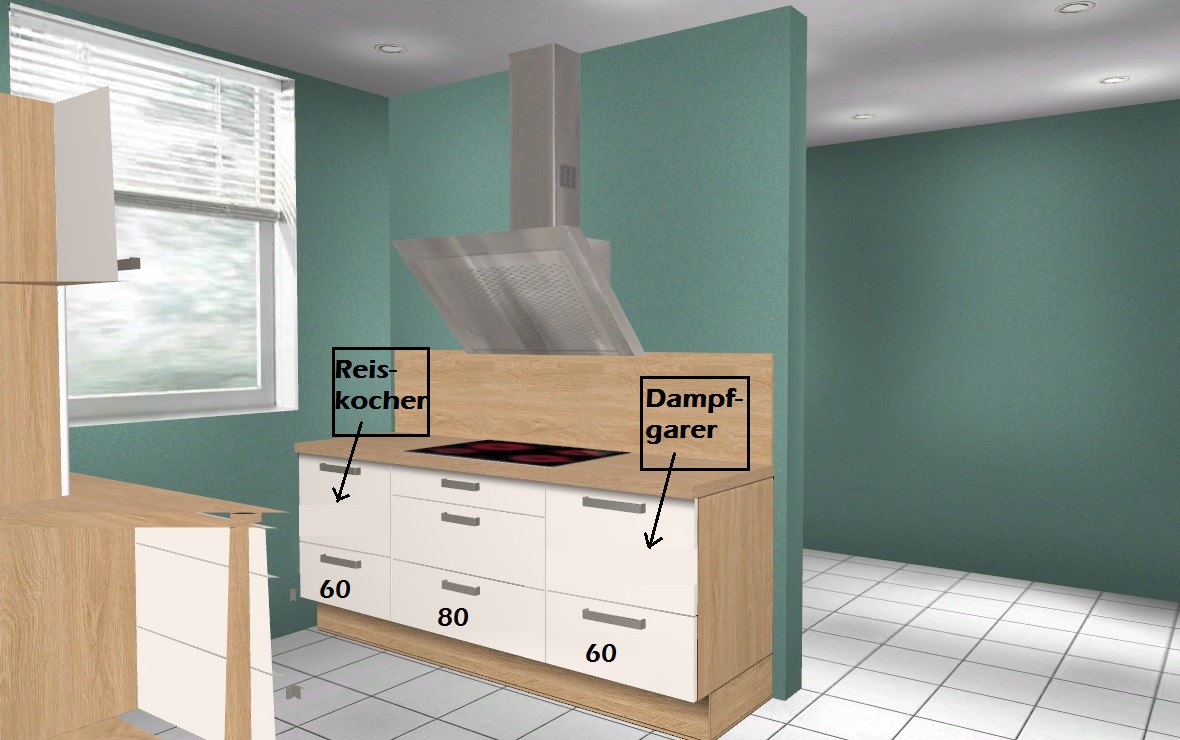 - über Heizkörper geht die Arbeitsplatte mit 50cm weiter, da doch viel von dieser benötigt wird und teils mit eine Menge an Geräten zugestellt wird - Reiskocher, Eierkocher, Dampfgarer (Suppe), Dampfgarer (für Fisch oder ähnliches).
