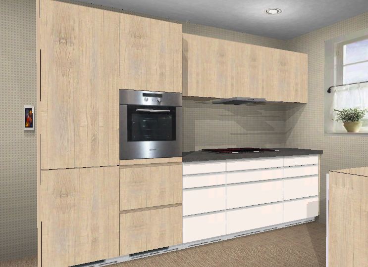 Ich hab die Kochzeile aus Evas Planung mal etwas umgestellt. Ich würde sie etwas länger machen, damit rechts und links des Kochfelds mehr Platz ist. Gleichzeitig gibt das natürlich auch mehr Stauraum. Außerdem würde ich überlegen, ob grifflos bei eurer Planung sinnvoll ist. Mit grifflos verliert man auch immer Stauraum, weil das Greifraumprofil Platz braucht. Bei einer Planung mit Griffen, erhält man eine Stauraumebene mehr! Das könnten ja auch aufgesetzte Griffe, so wie in Muckelinas Küche sein, die wirken auch sehr ruhig.