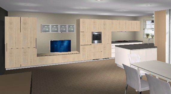 Dabei könnte man dann den Bereich, der quasi im Wohnzimmer steht mit einer holzigen Front wählen, den Rest in hellem Schichtstoff .