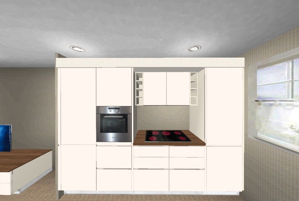 Planunten links dann 50er/60er Hochschränke, z. T. mit Innenauszügen .. Fernsehbereich, dort evtl. Glashänger, dann den Hochschrank für die Standmikrowelle. Da würde ich ein Fach so hoch wie das Backofenfach wählen und dann eine Tür davor. Ansonsten weiter wie Conny, nur, dass ich eine Flachschirmhaube angedacht habe. Dann gibt es noch zusätzlichen Hängeschrankplatz.
