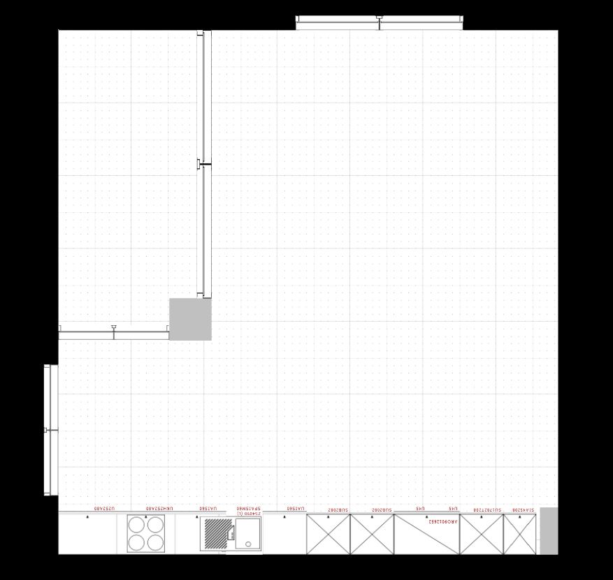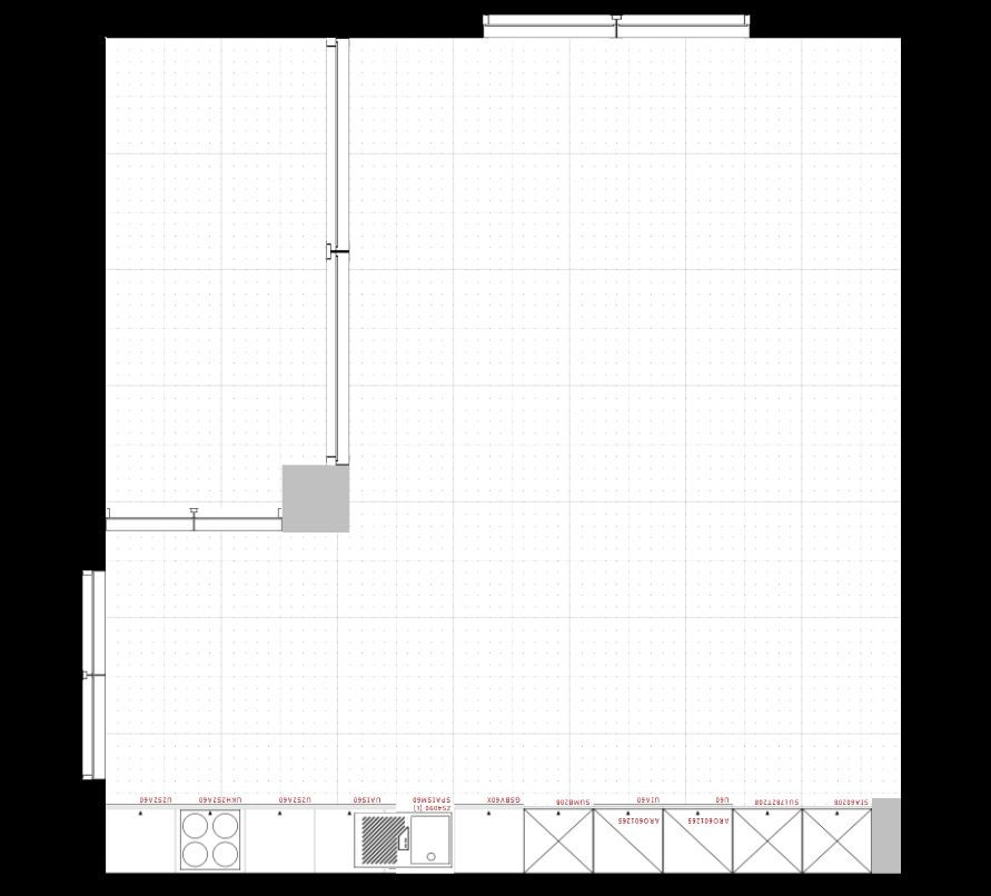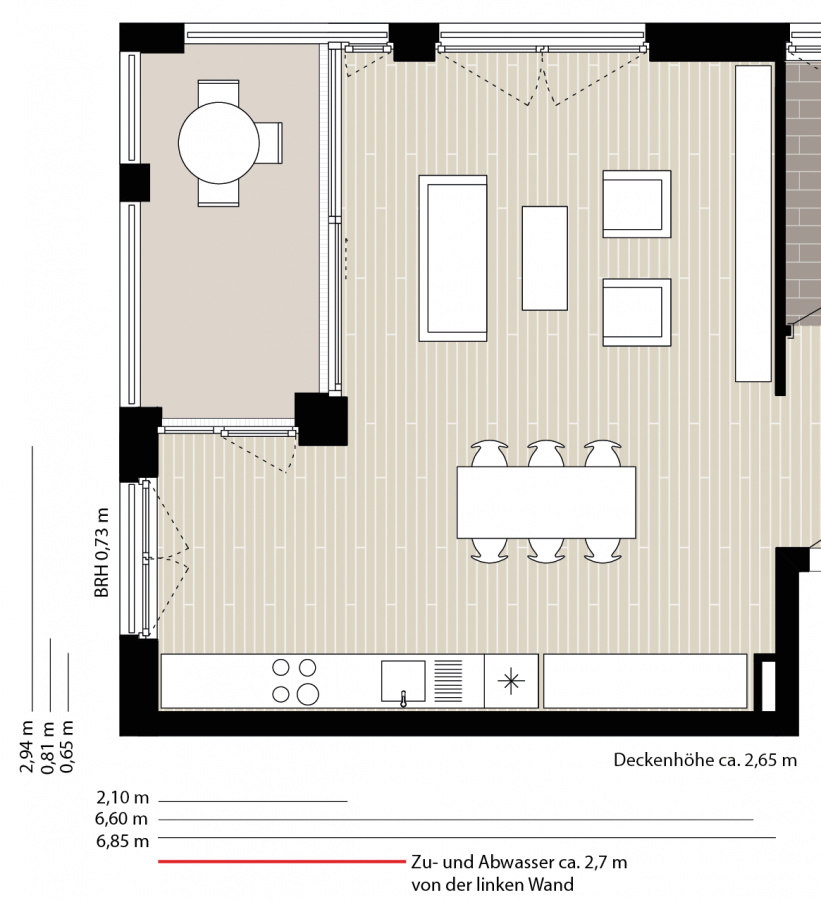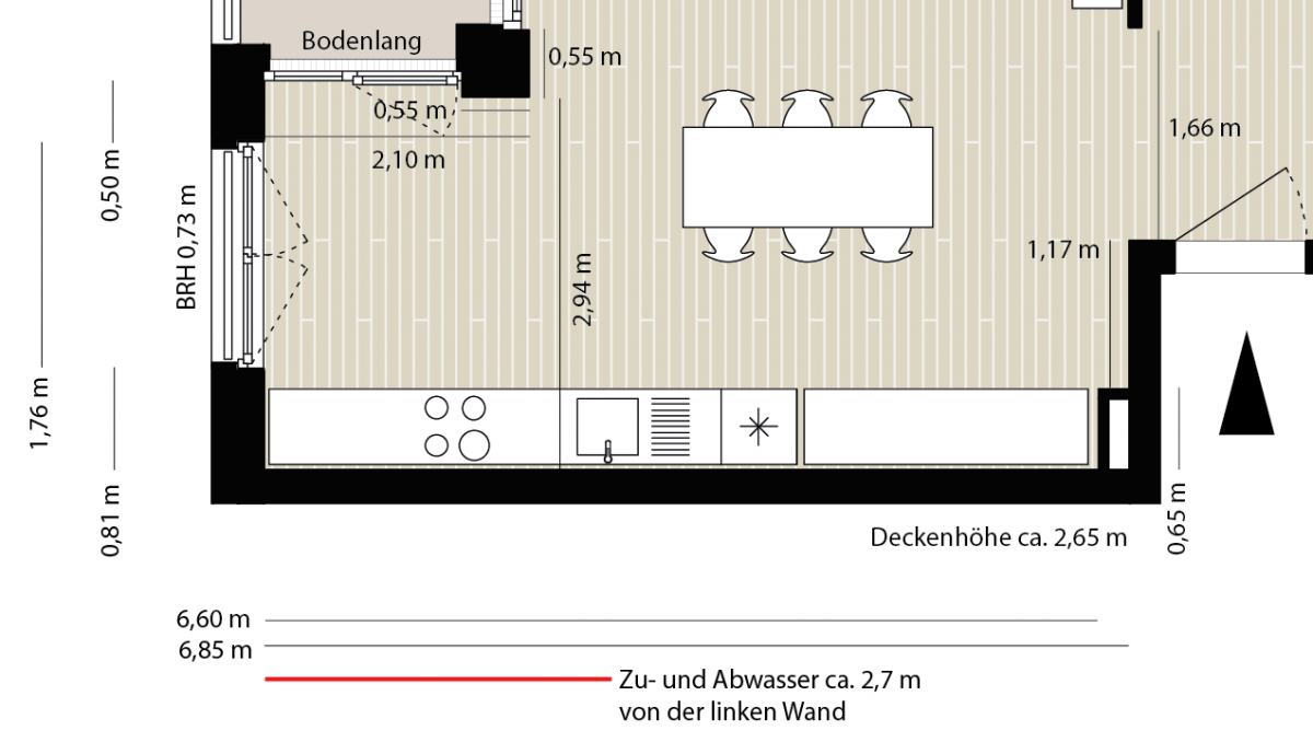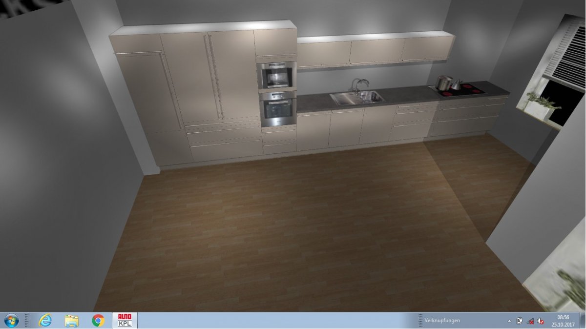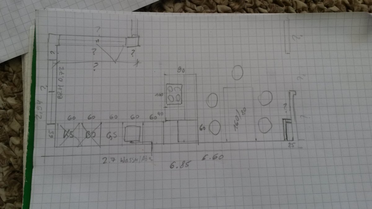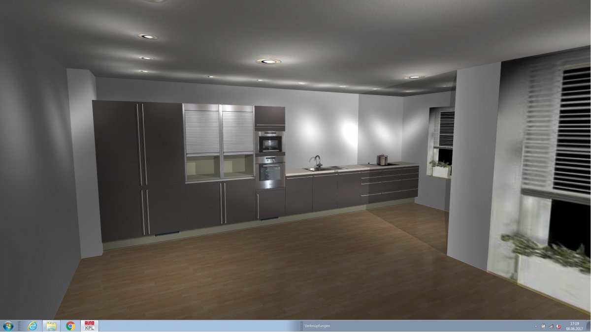 Die Küche befindet sich in einem Raum, der Küche, Esszimmer und Wohnzimmer vereint. Erschwerden kommt hinzu, dass die Küche möglicherweise nur als eine lange Zeile geplant werden kann (?).