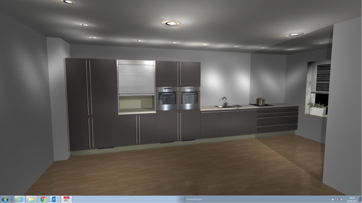 - Die Rolladenaufsatzschränke in der u.g. Planung sind eigentlich eine Nische mit Türen, in der wir die Kaffeemaschine und den Blender unterbringen wollen. Der Planer hat leider ein solches Möbel nicht hergegeben.