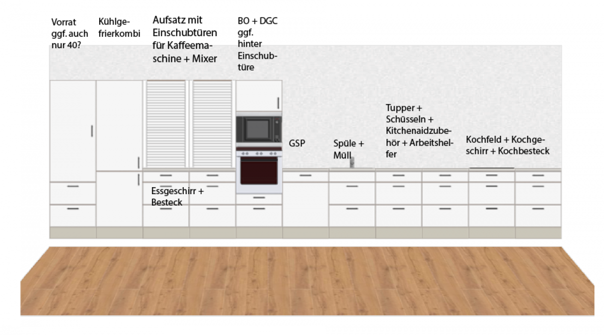 Was soll in der Küche außer den Standards untergebracht werden?: Geschirr komplett (nichts in Ess-/Wohnzimmer)