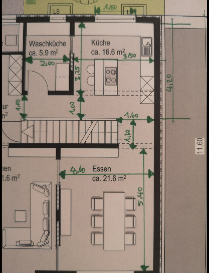 4. Mit den Anforderungen von heute und den Erwartungen an die digitale Zukunft würde ich mit Kindern einen Allzweckraum „Küche und Kommunikation“ planen. Der Esszimmer-Bereich würde einen digitalen Arbeitsplatz /-Bereich erhalten.