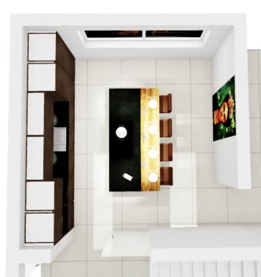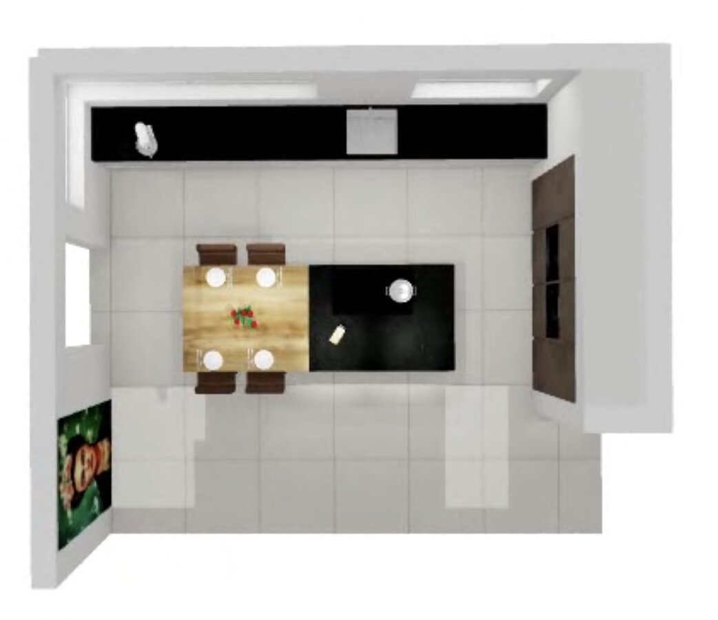Ja genau, die Insel könnte man als Arbeitstisch und Sitzplätze nutzen. Das Kochfeld an die Stelle von der Spüle und die Spüle mittig am Fenster zur Strasse hin.