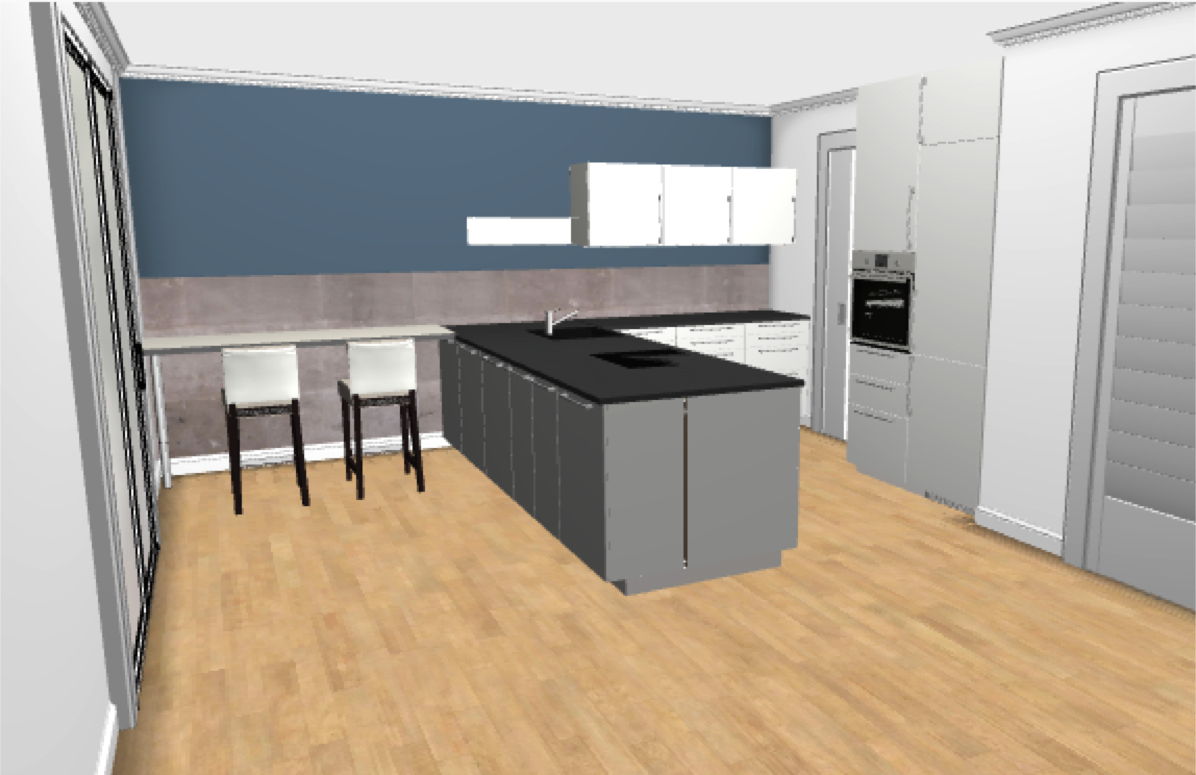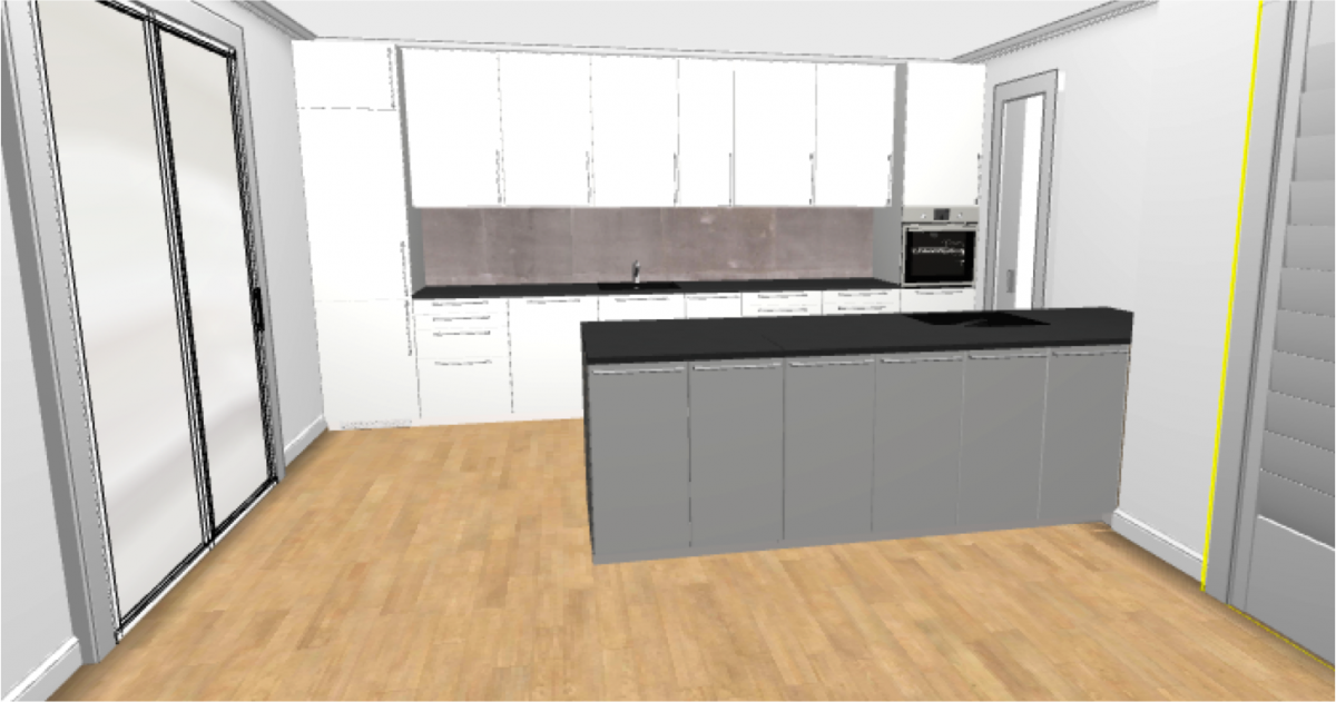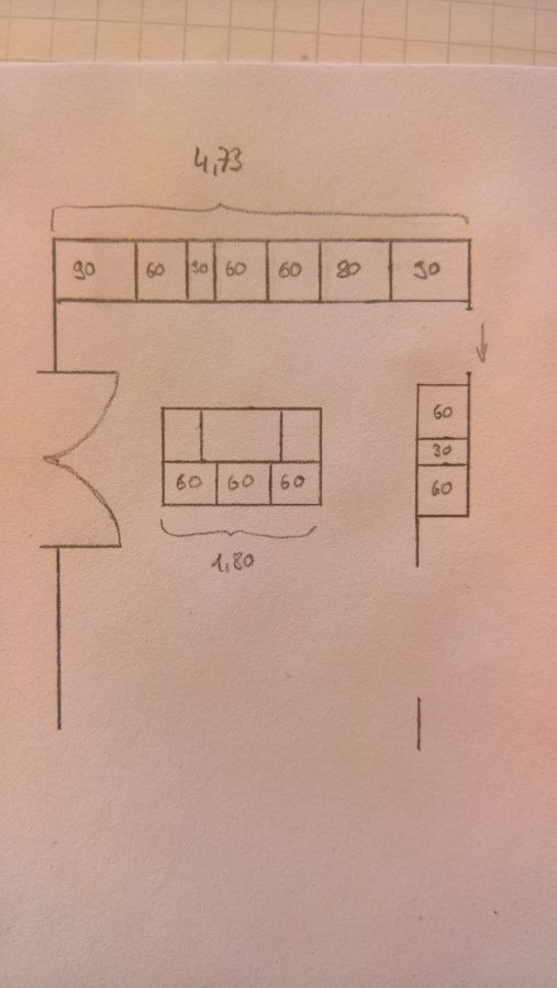 Was uns noch nicht so optimal gefällt ist die Aufteilung der langen Zeile. Aktuell ist die Planung von links nach rechts 90 - 60 (GSP) - 30 (MUPL ) - 60 (Spüle) - 60 (Allesschneider) - 80 - 90. Die Hochschränke dann auf der rechten Seite 60 (BO) - 30 - 60 (Kühlschrank). Die Insel ist mit einem 80er Kochfeld geplant und auf der Rückseite mit drei 60er Schränken mit Tip-on.