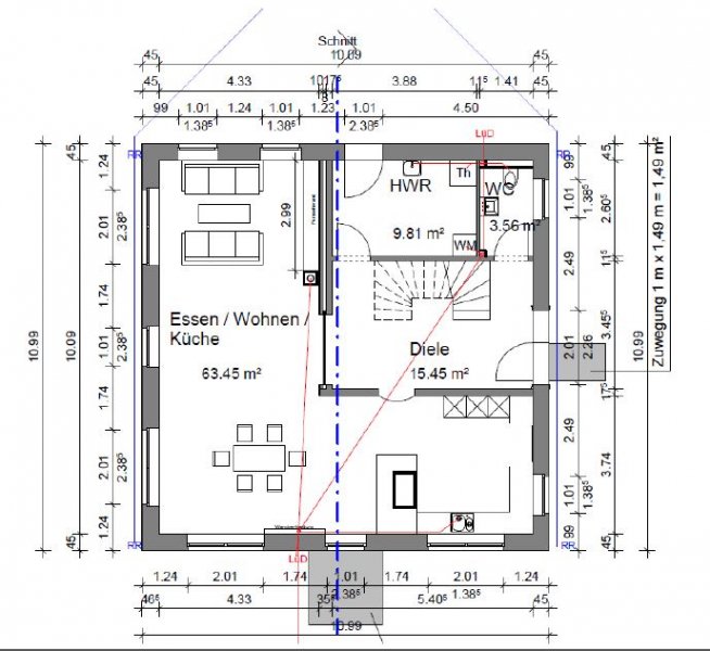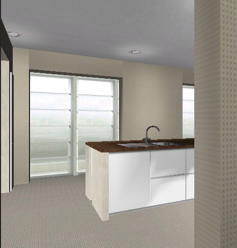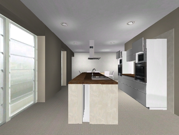 - Hm, mit der Inselgröße...der Durchgang sollte nicht kleiner werden, deswegen ist die Länge ziemlich ausgereizt. Jetzt sind es 1,28m. Das ist ein guter Wert oder? Wir könnten die Insel noch tiefer machen, zumindest ein wenig bis dann die Terrassentür kommt. Oder hast Du da noch eine spezielle Idee?