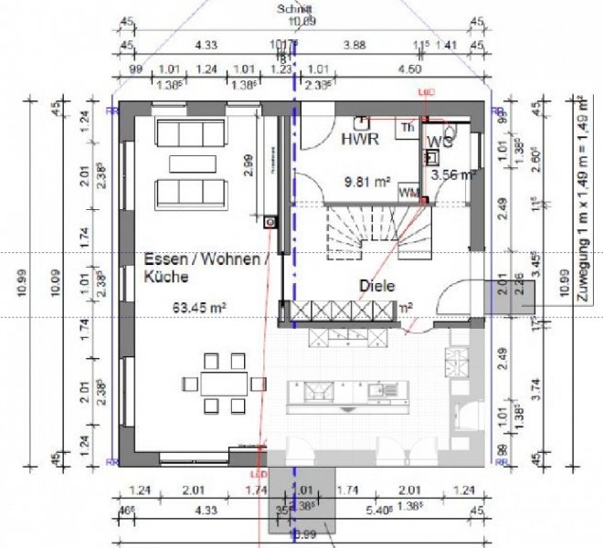 Außerdem, selbst, wenn du planrechts die Spüle übertief machst, sind da immer noch mind. 215 cm Abstand zur Kochinsel. Dafür hast du dem Gang nach planoben dann nur gut 80 cm gegeben. Und da muss alles durch, was zum Kühlschrank will. Nicht, wie bei der Inselvariante, im planoberen Gang wird gearbeitet und der planuntere Gang kann als "Weg" benutzt werden.