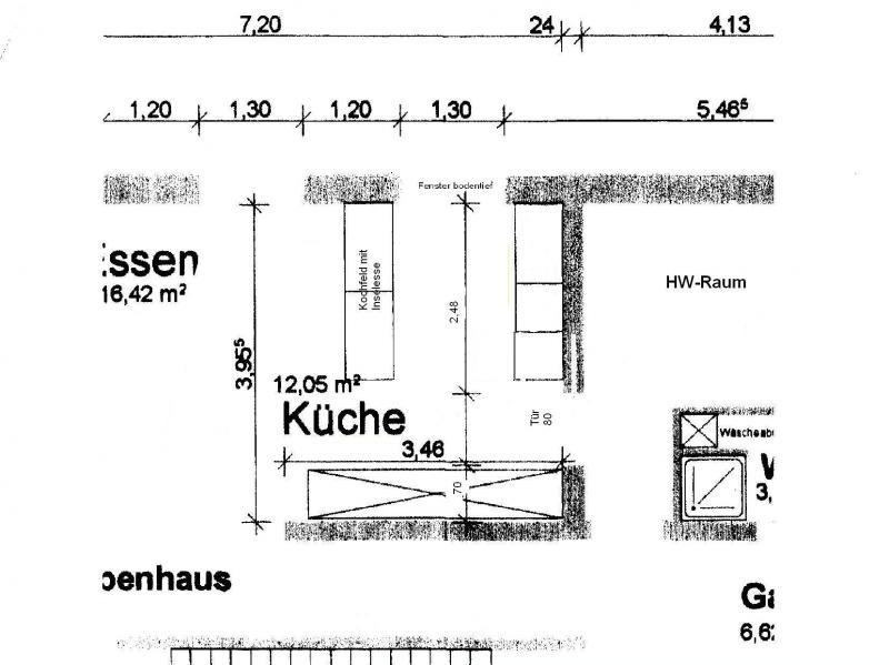 Könntest du bitte neben dem Küchenausschnitt vom Originalgrundriss auch mal einen größeren Ausschnitt mit anhängen? So dass man mal sehen kann, wie sich das weiter verteilt?