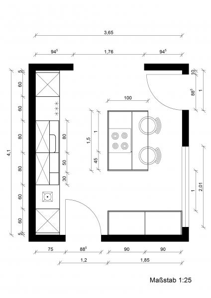 Habe nochmal ein wenig auf dem Papier gezeichnet, denke von planunten gesehen sollte der GSP der 3. Schrank sein, sind dann GSP und Müll (auf der Insel links neben dem Spülbecken) ausgezogen, verbleiben dazwischen ca. 75 cm.