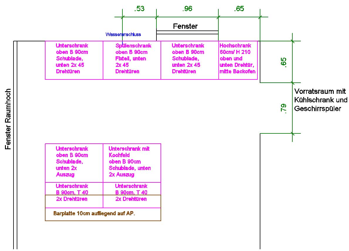 Hier der Grundriss. Im Alnoplaner habe ich die benötigten Teile nicht gefunden. (breite Schubladen, Schränke mit 40cm Tiefe)