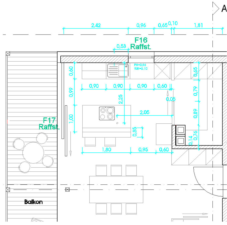 Dein Plan von der Küche ist leider nicht komplett vermaßt und der Geschossgrundriss fehlt. Außerdem wäre ein Alno Leergrundriss vom gesamten Raum gut (Screenshot vom Grundriss und kpl. und pos. Datei dazu)