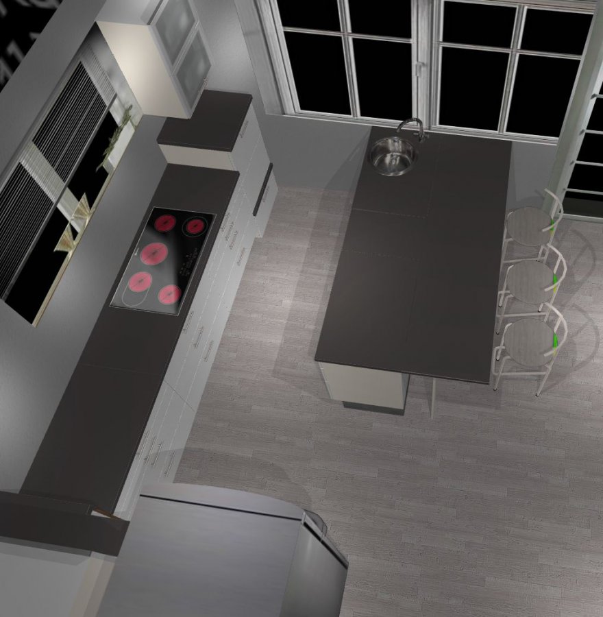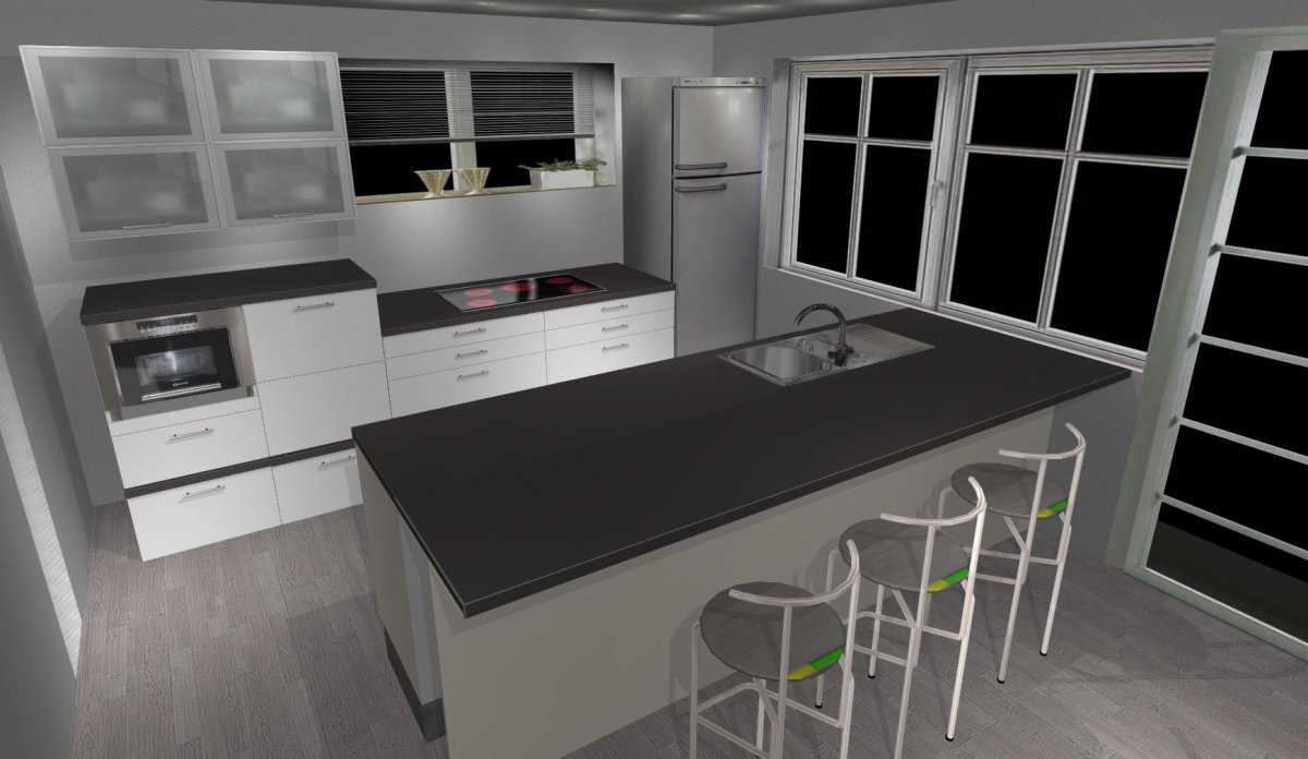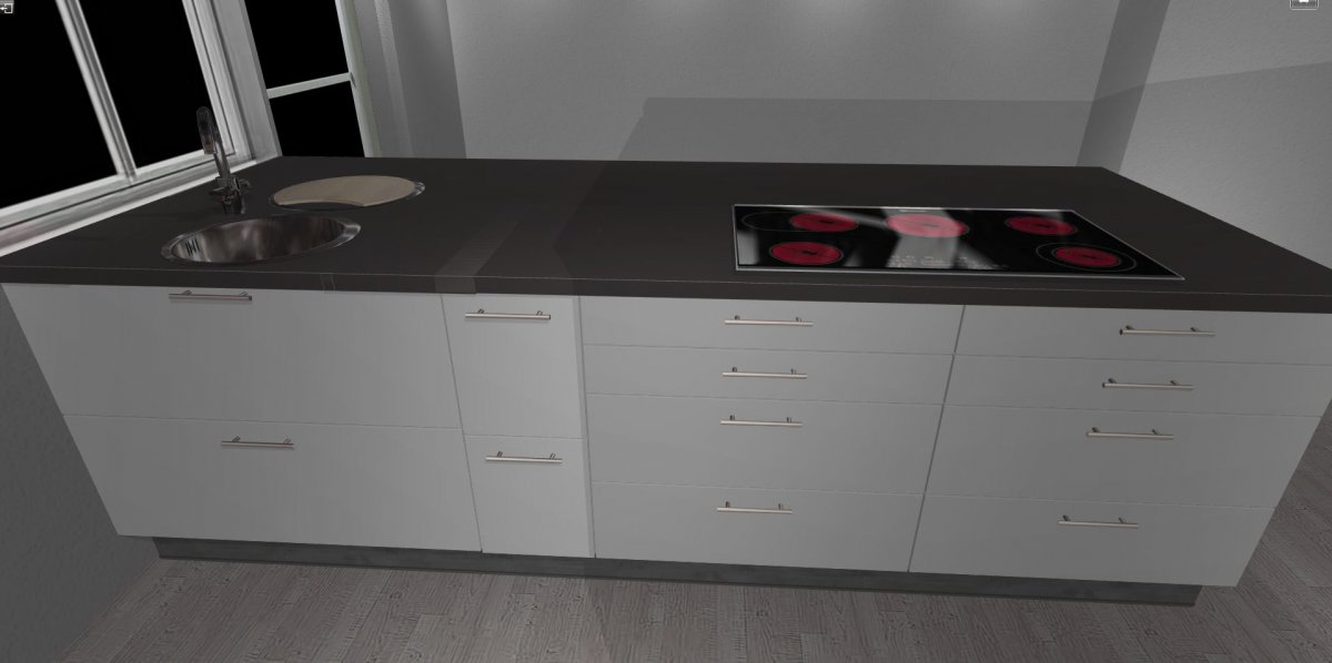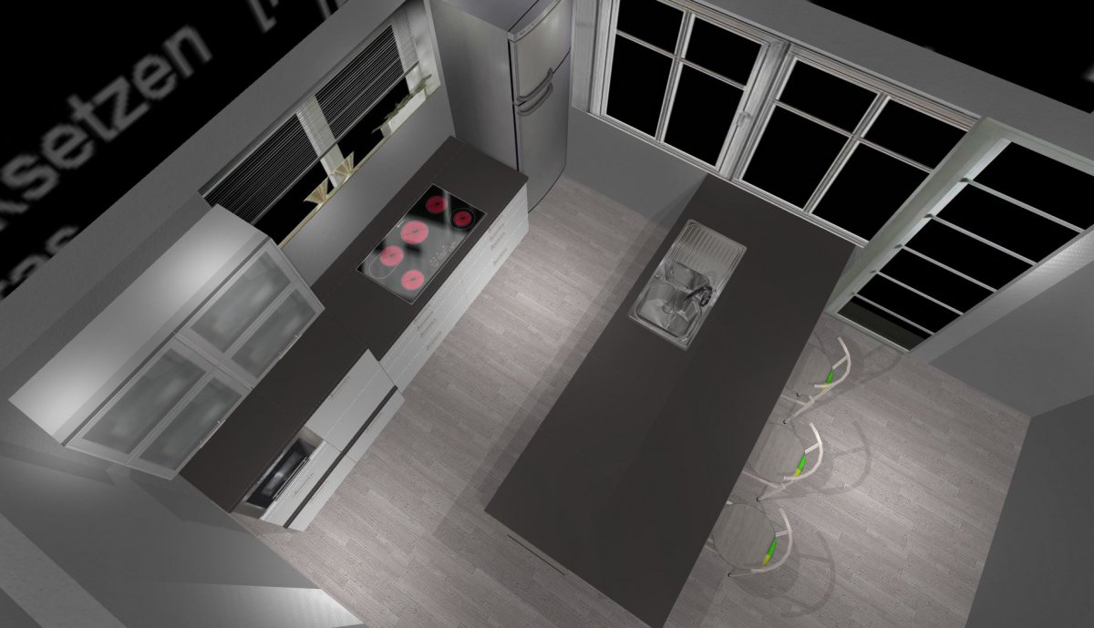 Den Kühlschrank hatte ich auch deshalb umbaut in der Mitte vorgeschlagen, damit es optisch besser integriert ist und die Problematik mit dem Öffnungswinkel umgehst, damit die Gemüseauszüge zum Reinigen raus können und auch bei Einräumen größere Öffnungswinkel möglich ist.