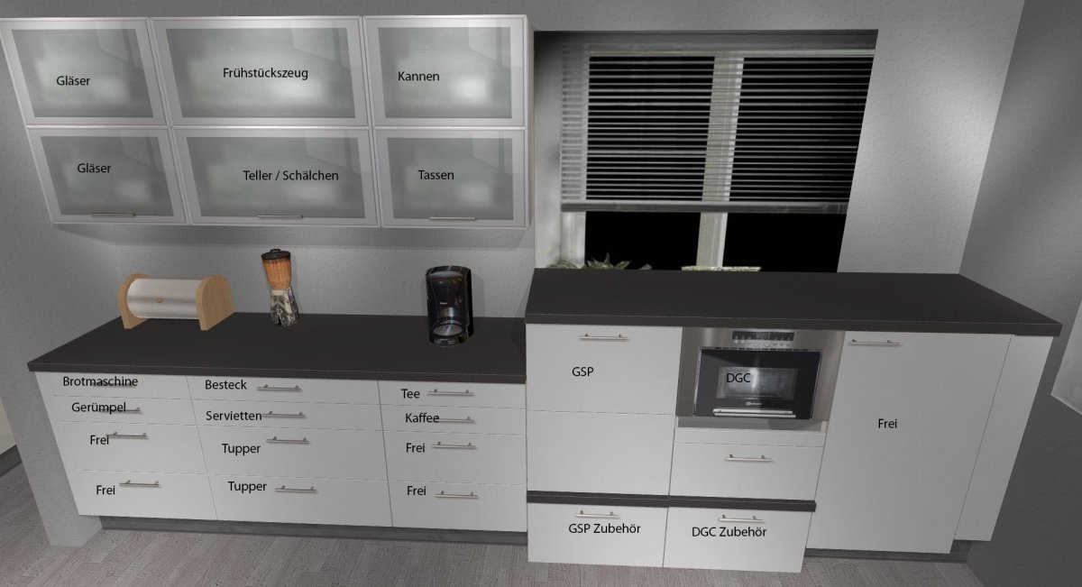 Die Spülmaschine möchten wir auf jeden Fall zentral haben. Meine Mum hat die in einer Ecke, und das finden wir extrem nervig. Wir wollen von beiden Seiten an die Maschine ran und ohne große Laufwege. Der DGC wird nur etwa 1x im Monat genutzt. Daher darf das gute Stück in die Ecke.