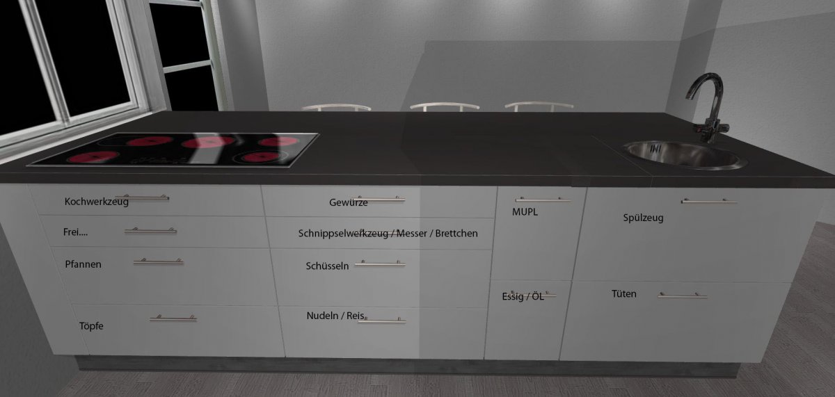 Ganz langsam könnte ein Schuh daraus werden - die Teller und Gläser würde ich in den Auszüge packen oder auch an der zum Wohnzimmer gewandte Seite (praktisch zum Tisch Decken, ohne Koch/Köchin zu stören) und den GSP... mittendrin kann man den nicht geöffnet lassen während man kocht, sondern immer zügig schließen, wobei mit Katzen wird man wahrscheinlich immer aufpassen, dass der GSP zu ist.