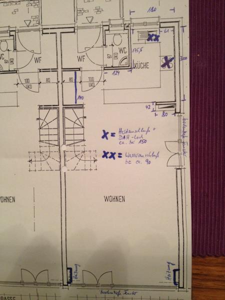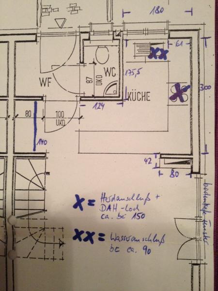 Der Wasseranschluss ist genau bei der eingeplanten Spüle. Der Herdanschluss ist an der Stelle der Dunstabzugshaube. Dort soll auch das Kochfeld sein. Ein Loch für die Dunstabzugshaube (15cm) ist ebenfalls vorhanden.