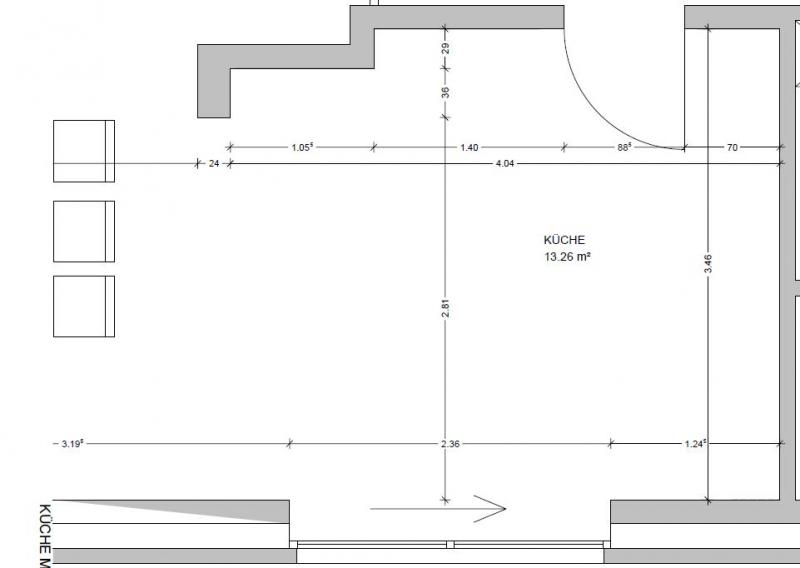 Was stört an der bisherigen Küche und was soll die neue Küche unbedingt können? Warum? : Einfach neue Ideen für die anliegende Zeichnung. Wir würden gerne direkt über die eingezeichnete Schiebetür in den Garten gehen können.