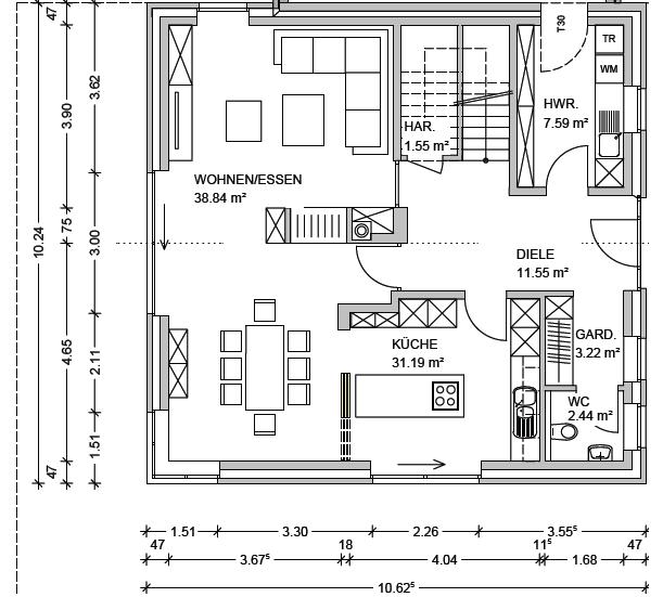 • die Schiebetüren nach draussen würde ich jeweils andersrum öffnen (Küche & Wohnen - das würde m.E. besser funktionieren - ich würde in der Küche den Durchgang im Anschluss an die Zeile / Gegenüber von der Türe wollen.
