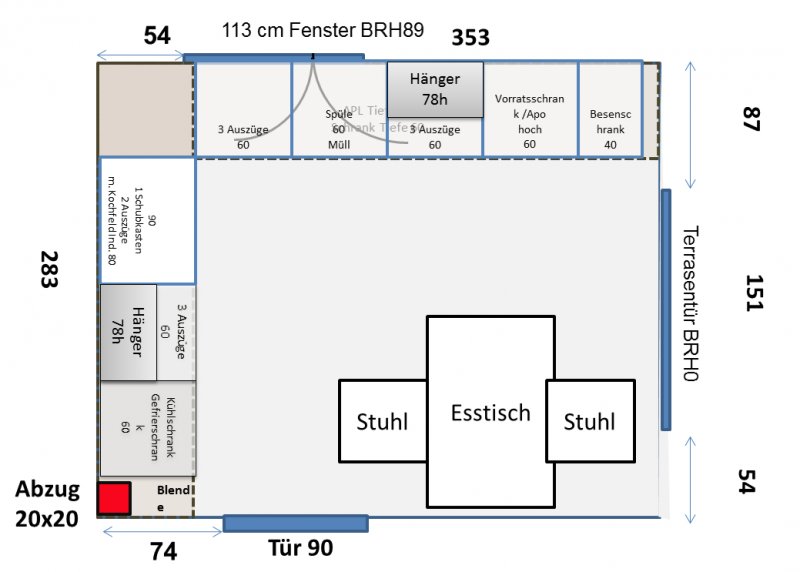 Ja was jetzt? Ich denke, Du meinst schon auch, dass Kühli hinter der Türe absoluter Schwachsinn wäre. Sorry für die Ausdrucksweise. Sowas kenne ich aus der Realität... Ja niemals einen Schrank hinter der Türe, welcher während dem Kochen öfter mal gebraucht wird. Besenschrank ist daher bestens.