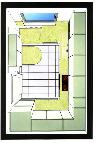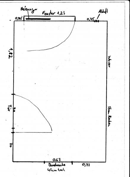 Die Küche ist mit 3,43cm x 220,5cm recht klein und liegt nach nord-osten, so dass nur morgens knapp 2 Stunden Sonne gegeben ist. Daher muss sie freundlich gestaltet sein.