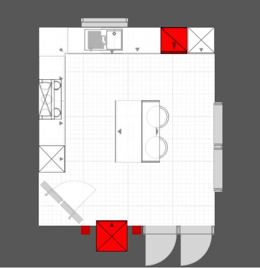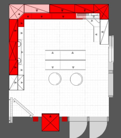 Da sieht man dann z.B., dass der Durchgang links von der Insel mit 80 cm ziemlich knapp ist und rechts von der Insel nur etwa 50 cm sind, was gar nicht geht.