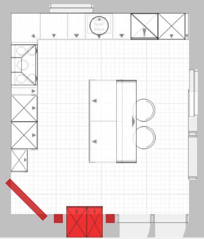 Ich habe mal einfach geplant. Dabei bin ich davon ausgegangen, dass der Wasseranschluss auch zur anderen Wand verlegt werden könnte. An der planoberen Wand habe ich die Hochschränke verplant und links über den Unterschränken nur zwei schmale Hängeschränke.