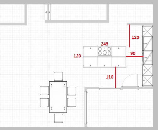 Die Tür hat einen Schwenkbereich von 120 cm. Gerade nochmal im Plan nachgemessen. Und dann halt noch so 10 - 20 cm Luft zur Insel, wenn die Tür vorbeischwenkt.