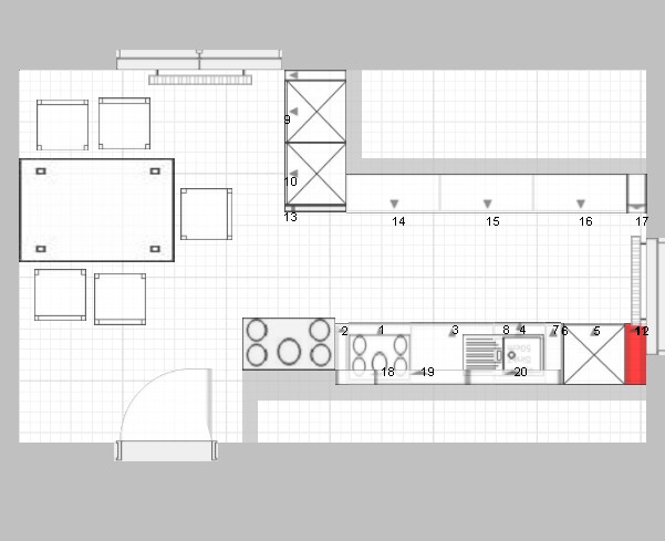 Es wäre aus möglich die Hochschränke planlinks unten neben die Küchentür zu setzten.