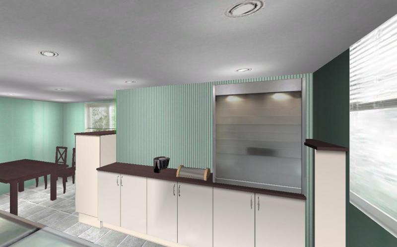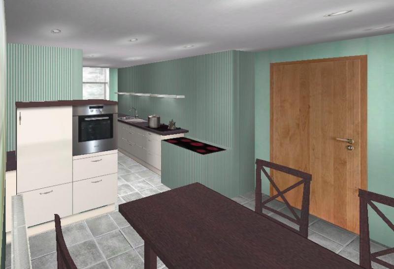 Auf der Kochseite würde ich den vorhandenen Holzofen auch mit einer Mauer zur Küchenzeile abtrennen.