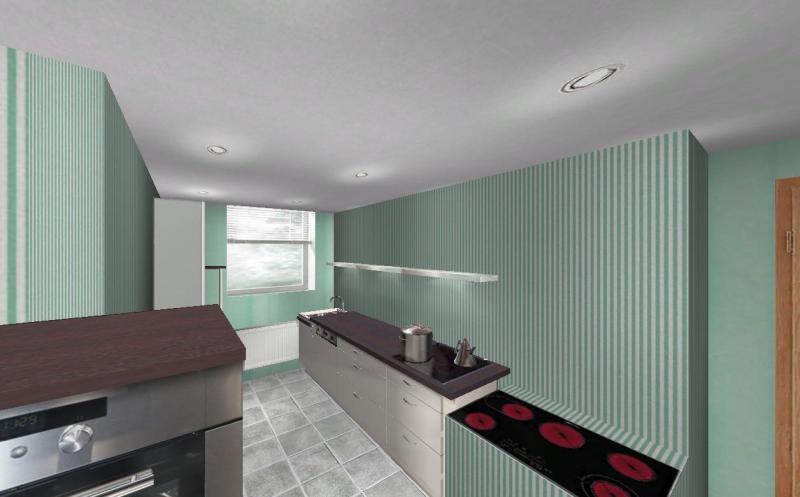 Generell hat man eine Deckenhöhe von 2,25 m, wobei vom neuen Herd aus ein Rohr an der Wand entlang hinter der Küchentür verläuft. Hier befindet sich seit Jahren die Garderobe und man kann an dieser Wand nichts planen.