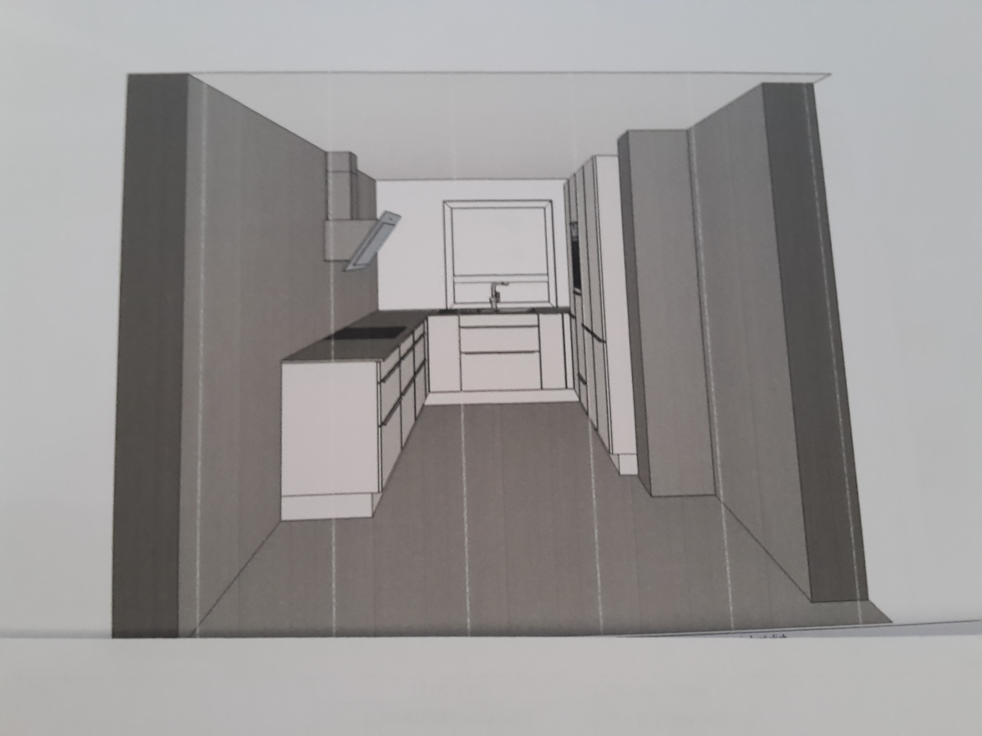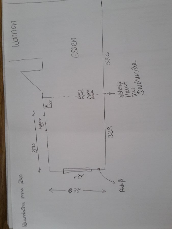 Was stört an der bisherigen Küche und was soll die neue Küche unbedingt können? Warum?: zu wenig Arbeitsfläche (insgesamt nur 3m), zu wenig Stauraum, nur kleiner Geschirrspüler , Kühlschrank unter der Arbeitsfläche.