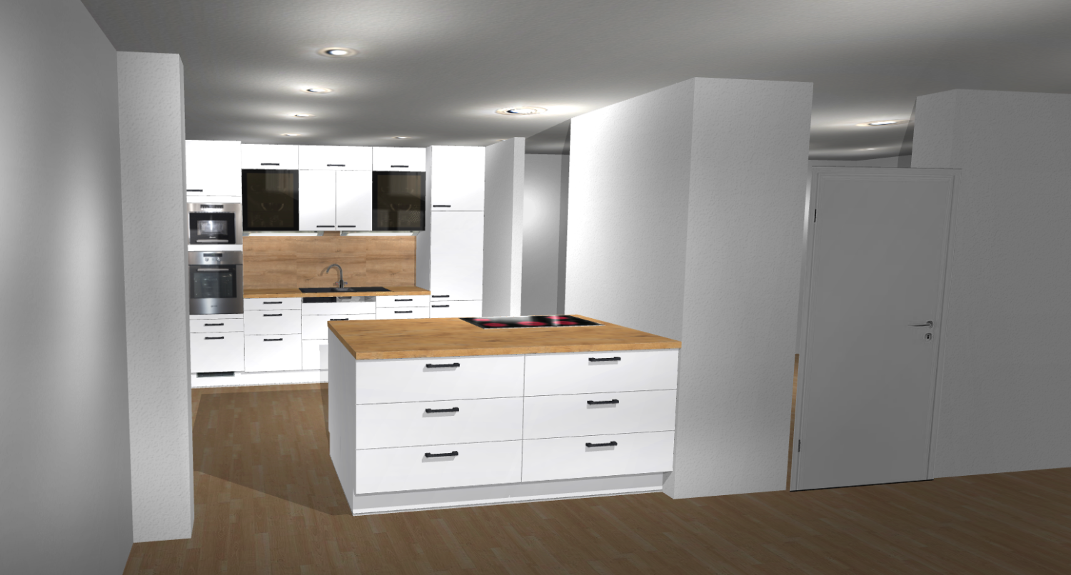 KF auf Insel habe ich bewusst so gewählt. Hintergrund: Position der Spüle würde sich nicht ändern. Wenn ich die Spüle auf die Insel legen will ist das mit hohem Aufwand verbunden die Rohre neu zu legen. Durch den Boden geht es nicht, da ich plane eine Fussbodenheizung in den Estrich einfräsen zu lassen.