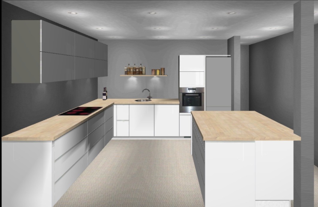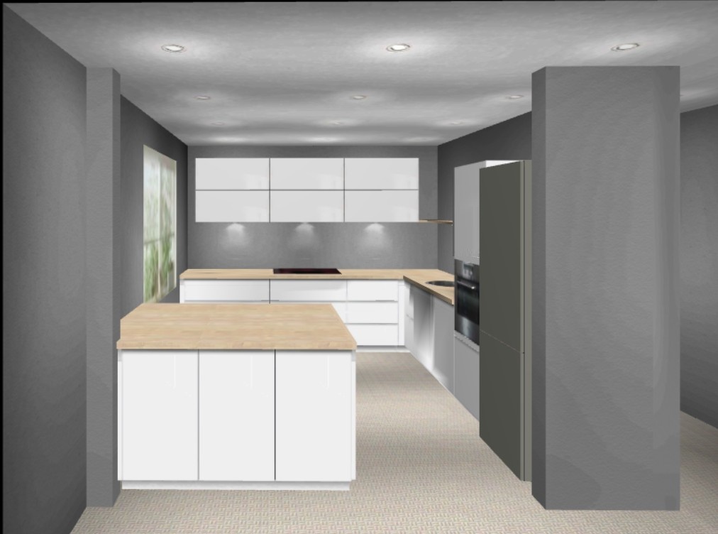 Habe mich bei der Küche ein wenig inspirieren lassen durch eine Küche die ich zuletzt bei IKEA (siehe unten) gesehen habe. Vielleicht sollte ich die Rasterung, Griffe und die weniger tiefen unteren Oberschränke auch entsprechend anpassen. Kosten für die Küche bei IKEA ohne Einbau lag bei 14K€.