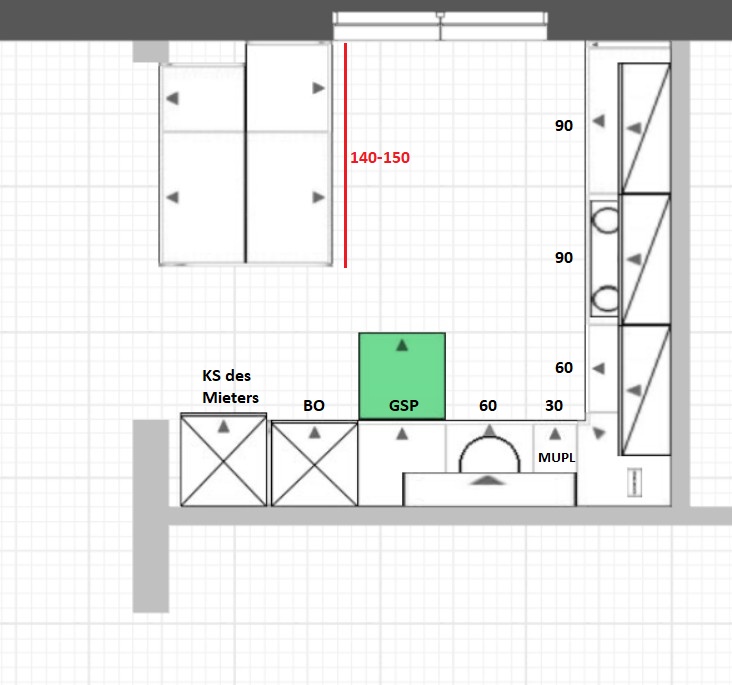 Ich würde die Flurtür schließen, weil man sonst nicht genug AP Fläche und Stauraum generieren kann. Als Mieter wollte ich keinen Einbau KS, die Auszüge können vom Vormieter Schimmelflecke haben. Deine Küche aus 2019 ist jetzt nicht soviel größer bietet aber von allem erheblich mehr.