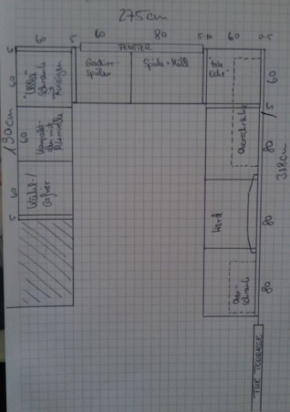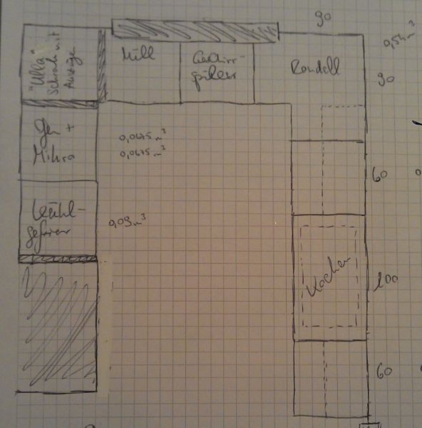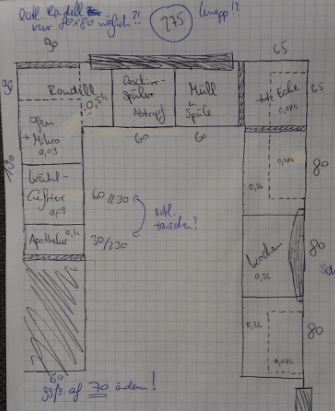 Ich habe nun auf Papier freihand neu geplant. Umgesetzt werden soll das ganze mit Nobilia Maxi- Korpus 86,4cm, Sockel 7cm, Slim- APL 1,6cm --> AH 95cm