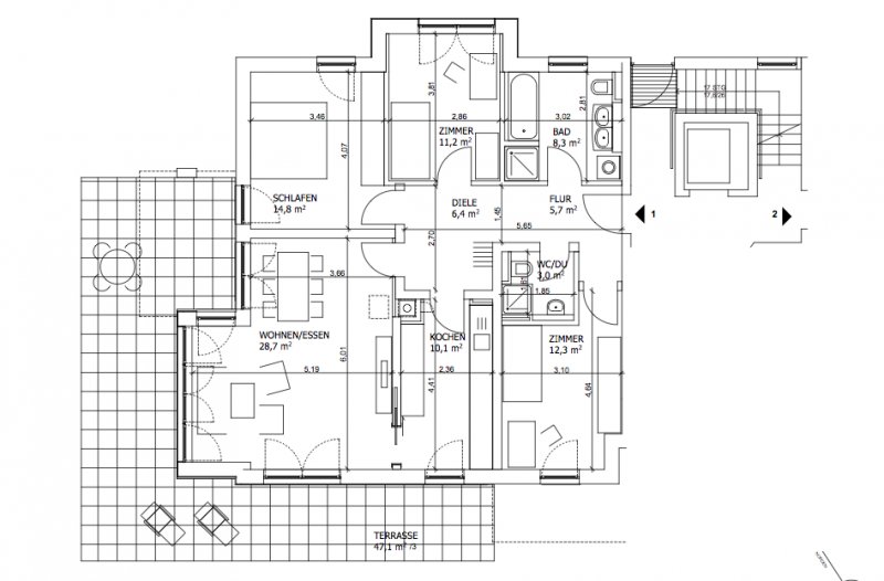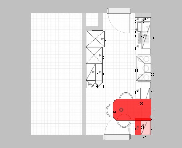 Wir haben uns eine Eigentumswohnung im Erdgeschoss eines Mehrfamilienhauses gekauft. Das Mehrfamilienhaus wird gerade gebaut, also ein Neubau. Da ja das ganze noch im Bau ist, haben wir auch noch Einfluß auf die Elektroinstallation und bedingt auf die Wasser-/Abwasserversorgung. Die Wasserversorgung kommt aus der Wand zum Gäste-WC und wird in der Küche "Aufputz" gelegt. Daher ist die Position der Spüle bzw. Spülmaschine eigentlich fest, da wir die Rohre nicht durch alle Unterschränke ziehen und damit wertvollen Stauraum verschwenden wollen. Die Küche erhält eine Fußbodenheizung, so dass es keinen störenden Heizkörper gibt.