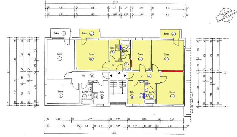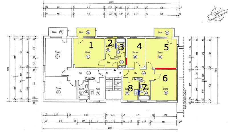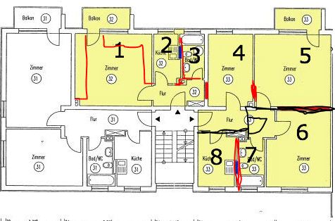 Genau genommen planen wir zwei Wohnungen zu einer Großen zu verbinden. In beiden Wohnungen sind die Küchenräume klein (8qm/5qm), was direkt mit der Vorstellung eines offenen Wohn/Ess/Kochbereichs kollidiert, so das hier definitiv noch Wände entfernt werden. Diese habe ich im Grundriß mit rot gekennzeichnet. Mein Plan ist, die Küche in das Zimmer unten rechts zu legen. Sämtliche Leitungen müssen entsprechend aus dem danebenliegenden Bad (Versorgungsschacht in blau eingezeichnet) herübergelegt werden. Durch das Entfernen der Wand entsteht dann ein leidlich großer Küchen/Ess/Wohnbereich. Ich gehe davon aus, das diese Leitungsverlegungen möglich sind