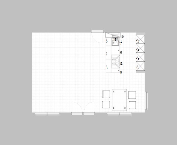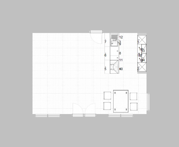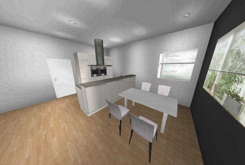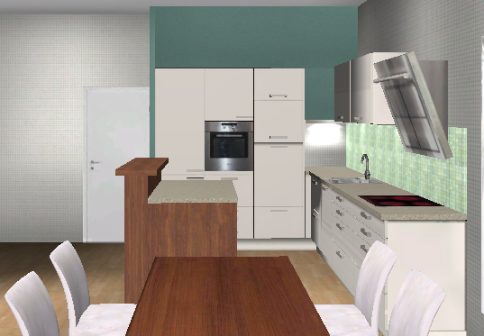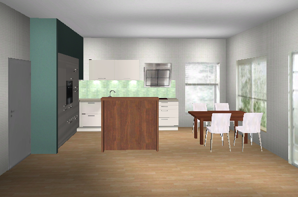 Ich koche einerseits recht wenig, d. h. die Küche wird wenig beansprucht. Andererseits ist sie Teil des Wohnraumes und soll ein vernünftiges Bild abgeben. Die im Grundriß eingezeichnete Aufstellung ist bedeutungslos, allerdings soll die Küche schon in die "Ecke hinter der Türe". Ich will nur soweit in den Raum hinein bauen (in Richtung der Fenster), dass in der oberen linken Ecke des Raumes noch vernünftig ein Tisch für vier Personen Platz hat. Die Türe kann ich noch ein wenig (max. 40 cm) nach rechts schieben, wenn dies nötig und sinnvoll ist.
