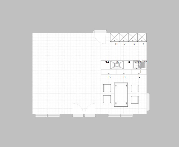 An Geräten habe ich mir vorgestellt: Induktions-Kochfeld (60 cm reicht), Dunstabzug, Spülmaschine vollintegriert, Spüle, Backofen hochgebaut, Mikrowelle , Kühl-/Gefrierkombination. Wenn es vernünftig möglich ist, möchte ich Kochfeld und Spüle in einem zusammenhängenden Teil der Arbeitsplatte haben, d. h. ich möchte zwischen Küche und Arbeitsplatte "nicht über die Straße gehen müssen".