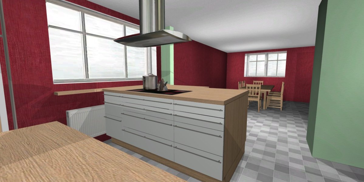 Zwecks der Größe habe die Insel jetzt mal gekürzt und den Esstisch "ausgezogen" auf 290cm. Das würde zwar auch knapp werden, aber bei ca. 10-12 mal im Jahr dürfte es funktionieren. Diejenigen, die links an der Wand sitzen müssten dann halt um die Insel rum, wenn sie mal raus müssten. Das wäre noch praktikabel...